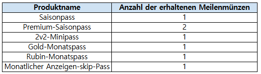 Mileage-Münzen können durch den Kauf von Pass-Produkten im Spiel erhalten werden. Die Anzahl der erhaltenen Münzen variiert je nach Produkt wie unten angegeben.