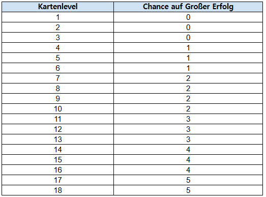 - Die Chance auf Großer Erfolg steigt mit dem Level der platzierten Karten; die Chance pro Kartenlevel findest du in der Tabelle unten.
