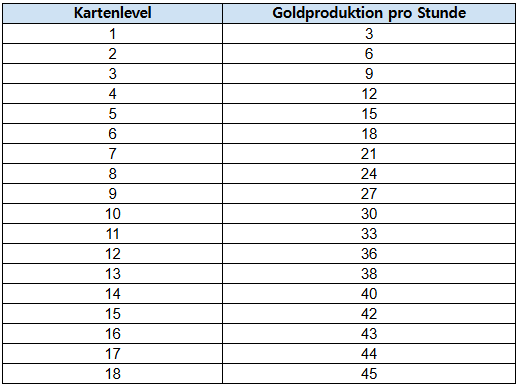 - Die Goldproduktion pro Kartenlevel kannst du der Tabelle unten entnehmen.