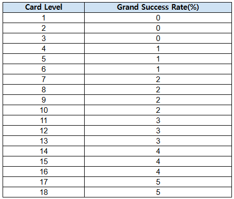 - The Grand Success Rate increases based on the deployed Card's Level. Please refer to the table below for rates by level.