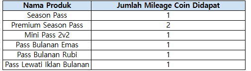 Mileage Coin bisa didapatkan dengan membeli produk Pass dalam game. Jumlah coin yang didapat berbeda untuk setiap produk seperti di bawah ini.