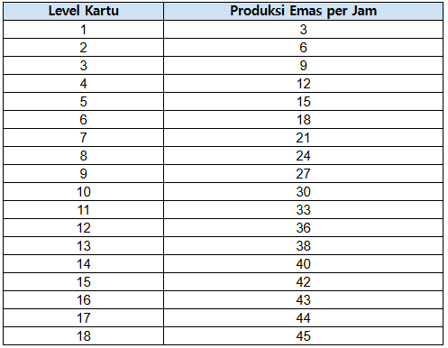 - Silakan lihat tabel di bawah untuk Produksi Emas per level kartu.