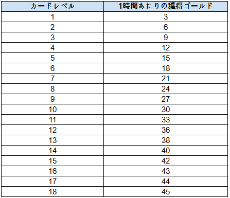 - カードレベルが高いほど、1時間あたりの獲得ゴールドが増加します。