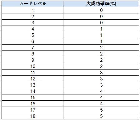 - 大成功確率は配置したカードのレベルに応じて上昇します。レベル別の大成功確率は以下の表をご確認ください。