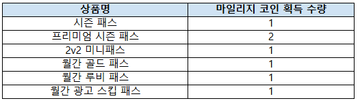 마일리지 코인은 패스 상품의 인앱 구매 시 획득할 수 있으며, 각 상품별 마일리지 코인 획득 수량은 다음과 같습니다.