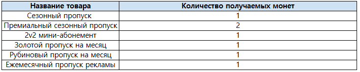 Монеты можно получить при покупке пропусков в приложении. Количество монет зависит от типа продукта и указано ниже.