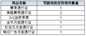 通过购买通行证类商品可获得里程硬币,各商品可获得的硬币数量如下。