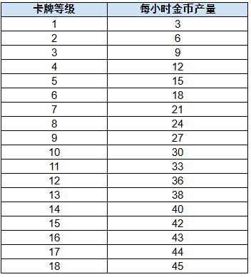- 各卡牌等级对应的金币产量请参考下方表格。