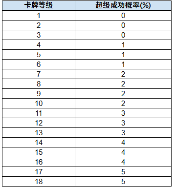 - 超级成功概率会随已配置卡牌的等级提升而上升,各卡牌等级对应的超级成功概率请参考下方表格。